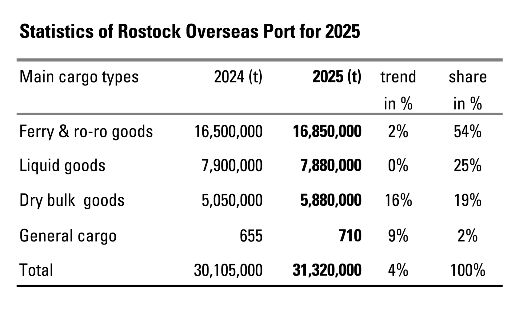 Once again and thus for the third consecutive year, cargo handling at Rostock Overseas Port exceeded 30 million tonnes. „At 31.3 million tonnes of cargo a new handling record was scored and last year’s result was exceeded by four percent”, states Dr. Gernot Tesch, managing director of the port operator ROSTOCK PORT. „The 2025 handling result confirms the efficiency of the companies and public authorities operating at the largest universal port on the German Baltic Sea coast. The port of Rostock is an economic beacon for the city and the federal state”.